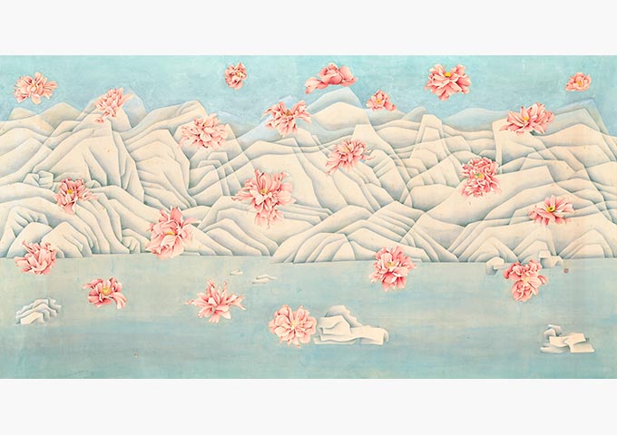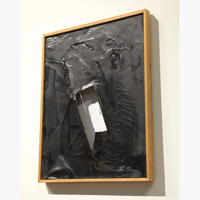 Inspired by the accidental rips and tears in the glued newspapers he used instead of canvas during post-war austerity, Shimamoto employed irregular tears and rips in the series to create a complex play of light and shadow across the surface of the canvas. In Work, the artist has created a visual passageway; a hole through which one can traverse the wall. Through Shimamoto’s destruction of the two-dimensional surface, Work takes on sculptural qualities – its irregular lines and rough texture highlighting the juxtaposition between destruction and beauty, echoing the wabi-sabi aesthetic of traditional Japanese culture.