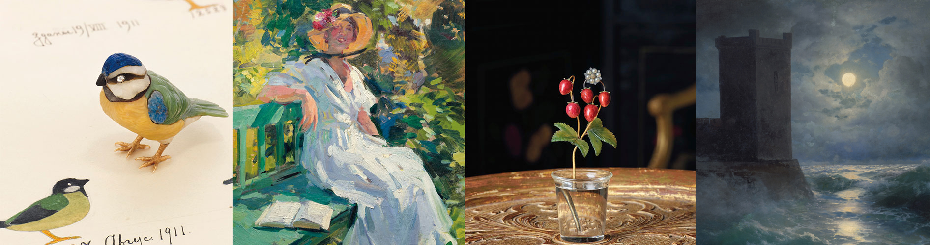 The Russian Art sale brings together a curated selection of paintings and works on paper by leading artists from the 18th to the 21st century, as well as Russian works of art, including Fabergé, jewellery, enamels, silver, Imperial and Soviet porcelain. Highlights from the Russian paintings section include a group of exquisite works by Sergei Chekhonin which feature a portrait of Leo Tolstoy, an impressionistic early canvas by Konstantin Korovin, and a moonlit seascape by Ivan Aivazovsky. The Works of Art section is led by an important private collection of Russian enamels, a rare model of a dormouse by Fabergé and a monumental bronze sculpture of Mephistopheles by Mark Antokolsky.