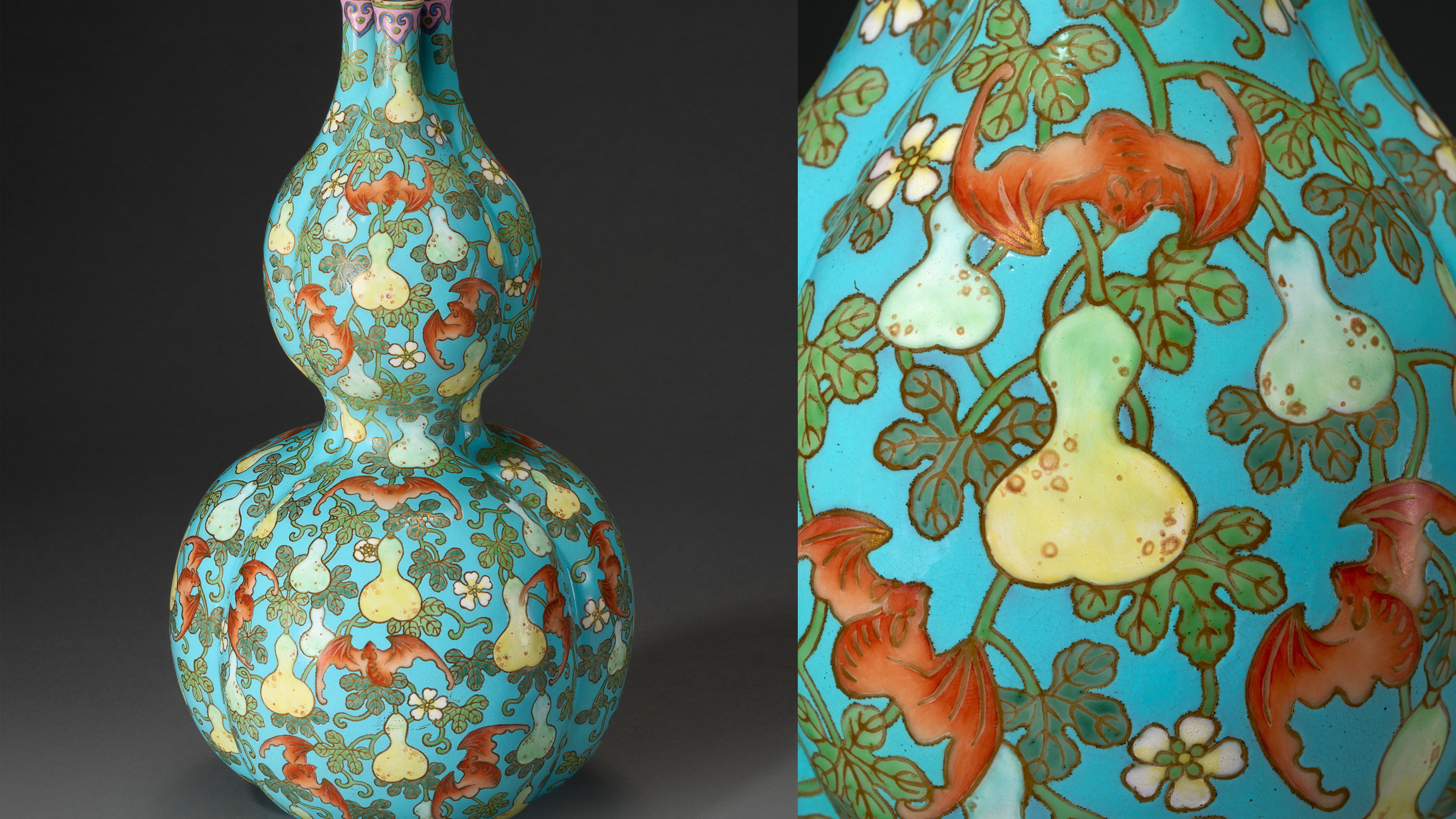 An exceptionally rare turquoise-ground famille rose double gourd-form triple-necked vase, Qianlong six-character incised seal mark in gilt and of the period (1736-1795). 13¼ in (33.7 cm) high. Estimate: $1,000,000-1,500,000. Offered in Important Chinese Art on 26-27 March 2026 at Christie’s in New York
