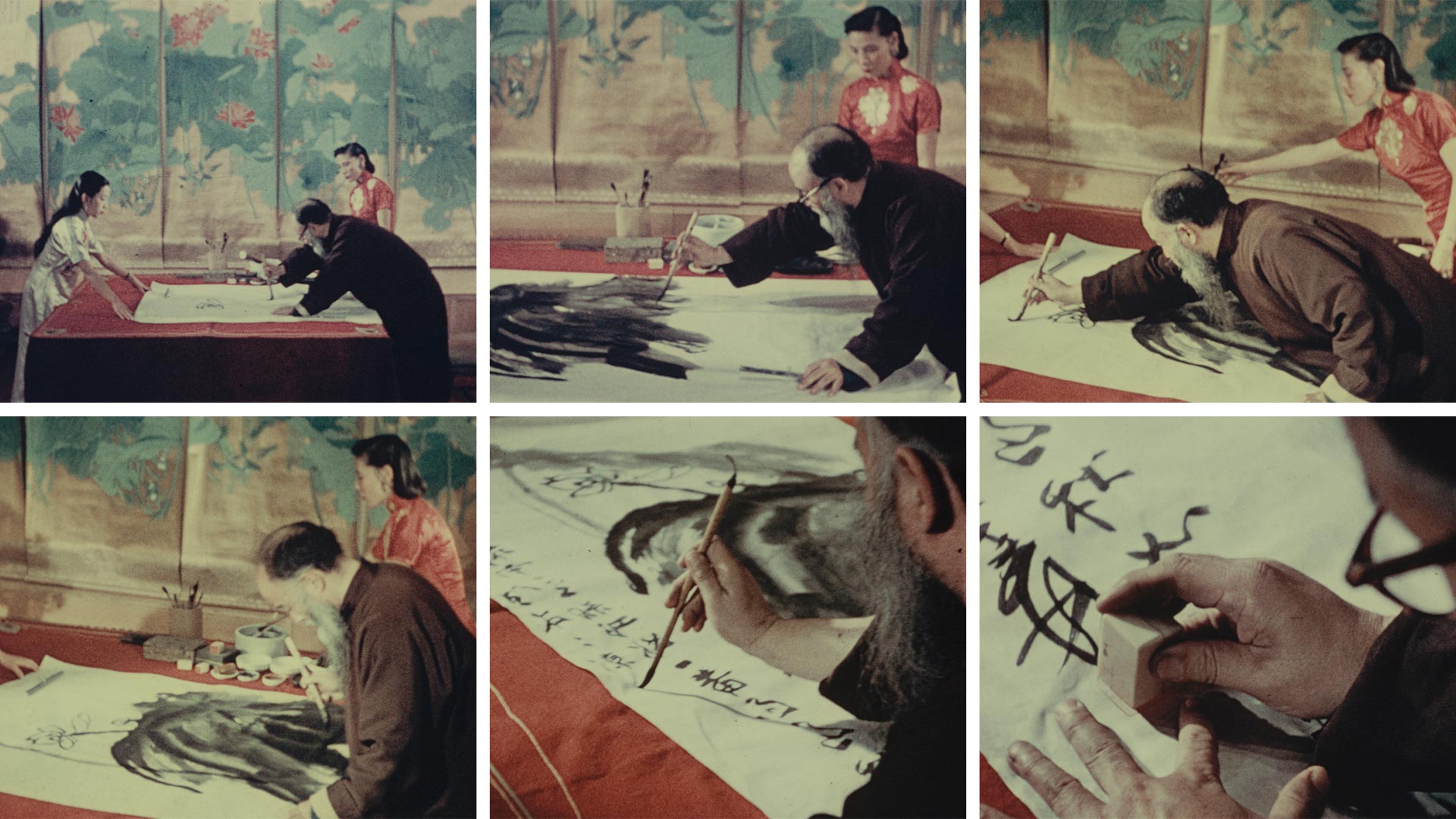 拍摄期间,朱旭华安排张大千以没骨法绘制一幅荷花。演示在旅馆的一间大厅内进行,张大千将自己的一幅六屏工笔荷花作品选作画案后的背景。他的妻子徐雯波在旁协助,另有一位助手在绘画过程中帮他牵引画纸。短短几分钟内,他将一张六尺白纸变成了一幅生动而富有张力的荷花图,并在画上题写了一首七言诗,最后钤上一枚印章。尽管朱旭华最终未能完成这部纪录片,但保留下来的影像资料成为张大千作画过程的第一部彩色动态影像——这是一份极具历史价值和教学意义的珍贵资料,为观者提供了难得的机会,得以窥见他的创作过程。影片记录了艺术家的身体动作、习惯性手势、执笔方式、描绘阔大荷叶时的流畅笔触,以及他落款、钤印的瞬间。