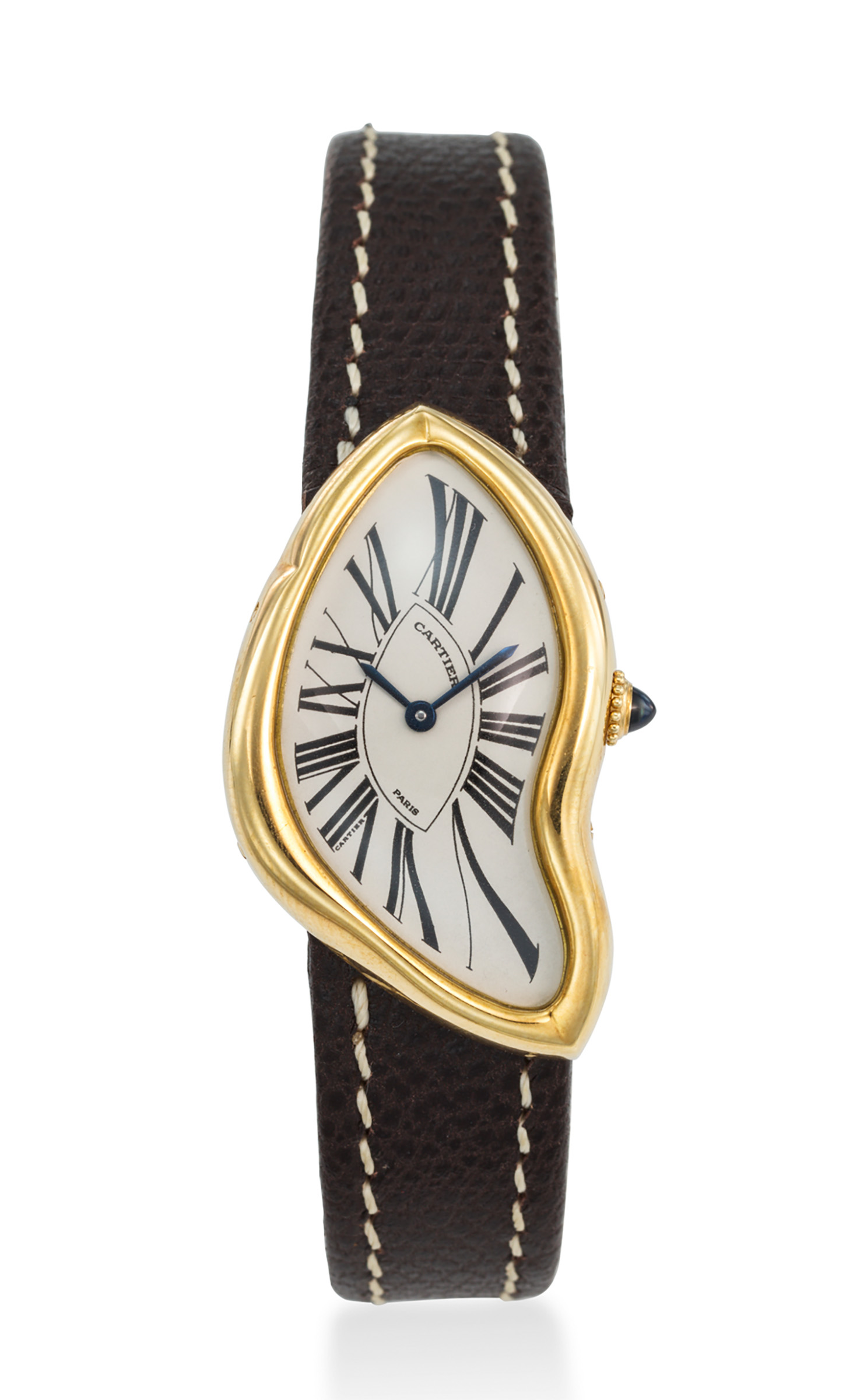 Cartier, a highly desirable and rare 18k gold limited edition asymmetrical wristwatch with ‘Crash’ deployant clasp, c. 1991. Sold for $277,200 on 21 February 2024 in The Collection of Sir Elton John: Opening Night at Christie’s in New York